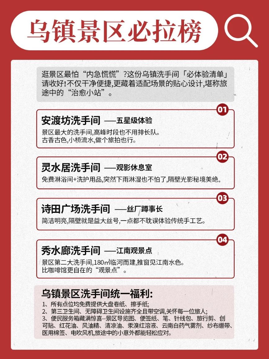 乌镇的洗手间,是被游客捧红的“隐藏景点”! 它可以是绝佳观景台, 也可以是带淋浴的“观影休息室”。 在这里,解决内急的同时,还能打卡拍照, 彻底刷新你对景区洗手间的刻板印象!