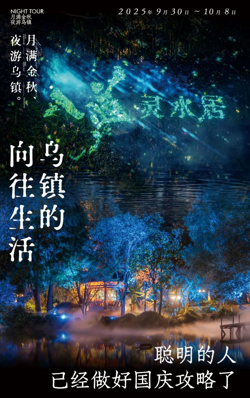国庆,乌镇上新! 黄昏渐沉,橹声暂歇 乌镇西栅的灵水居却悄然苏醒 白墙黛瓦褪去日间的素雅 化身一场流动的光影梦境 《入梦灵水居》沉浸式光影秀 以光为笔,以水为墨 将江南园林绘成一首可步入的诗