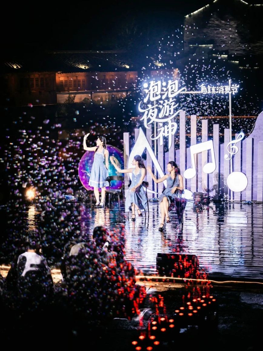 当夏夜有了形状—— 是泡泡的弧度 啤酒的泡沫 音乐的波长 乌镇水剧场焕新登场 举起酒杯跟着乐队一起摇摆 伸手触碰漫天的彩虹泡泡 这一次一起成为夏夜的参与者