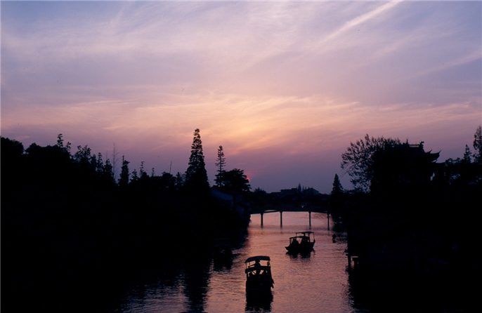 当夕阳逐渐西斜, 火烧云铺满整个天空,小镇里沸腾的夏日时光趋向安静,乌镇的夜色来了,温度渐凉。