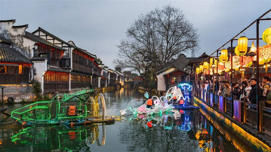 今年是生肖蛇年,乌镇特别打造了“机甲蛇花灯”,科技感十足的蛇形花灯与乌镇非遗技艺“蓝印花”的艺术融合,带来结合科技与传统的碰撞,让新年更添未来感!