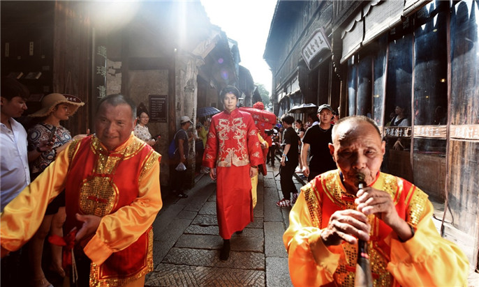 一路吹打,新人花轿沿着西栅老街一直行进到沈家戏园,三拜后礼成,当天所有现场的游客都是他们爱情开花结果的见证。