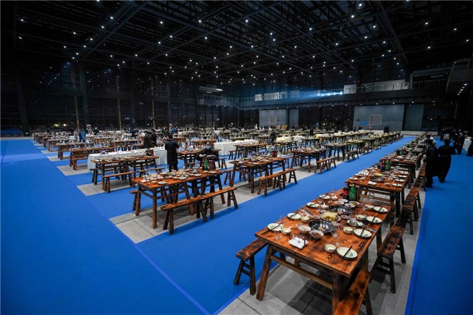 适逢下雨,会议团原计划的古镇长街宴调整在乌镇互联网国际会展中心进行,乌旅人冒雨将200余方桌齐刷刷搬迁到了会展中心,以木桌相连的方式呈现了别样的“长街宴”。
