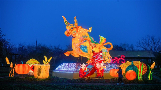 7500平方米的龙形田,夜晚星光点点,2组寓意吉祥、喜庆璀璨的大型灯组。辛丑牛年,福牛来贺岁!