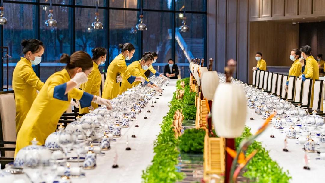 早在大会筹备初期,他们就开始从摆台、出菜、斟酒,到各项细节化服务反复进行训练。在现场,对餐具的摆放标准也几乎达到了“苛刻”的地步。