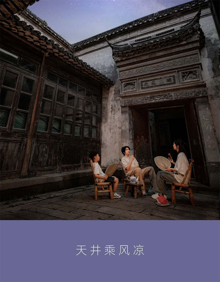 这些家家户户惯常见到的天井,正是炎热的南方极为常见的建筑结构。在空调远未出现的遥远年代,凉风循着天井产生源源不断的自然气流,为屋舍带去凉意。阖家老少相聚于此,吃纳凉饭、观星谈天,发展演变成乌镇常见的纳凉习俗——天井纳凉。