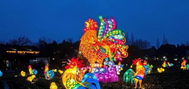 该组灯彩为2017农历鸡年而特别制作,以151只“吉祥鸡”组成的一个庞大的“金鸡报晓”群,立于偌大的龙形田,6米高的五彩雄鸡昂扬气势,黄嫩可爱的小鸡仔油菜田中“觅食”嬉戏,这个灯彩既有“群鸡报晓”的壮观气势,更有田野乡村的“野性美。