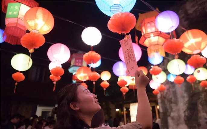 除了这一场丰收晚宴,我们还准备了其他中秋的“惯例”活动。猜灯谜、月饼diy体验等。在西栅景区,昭明书院和桥里桥花灯铺外,也挂起了各异的花灯,红绸上写好了灯谜——老规矩,猜灯谜赢奖品!